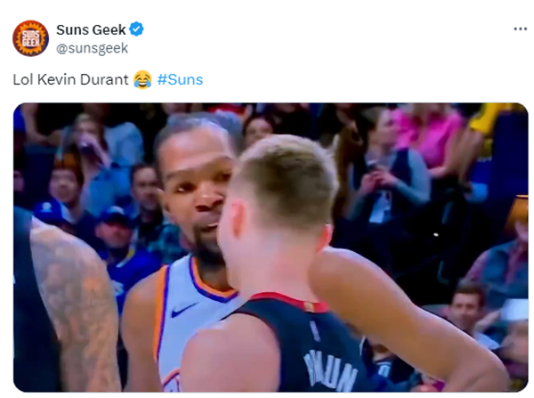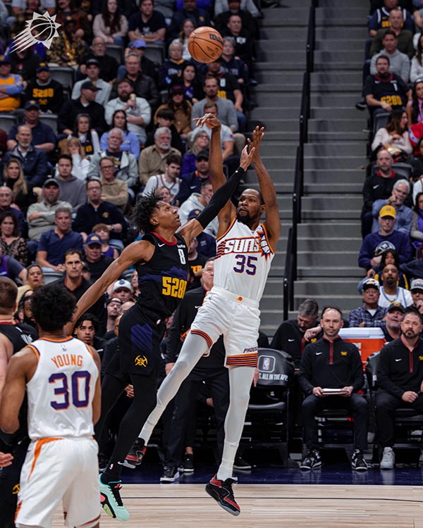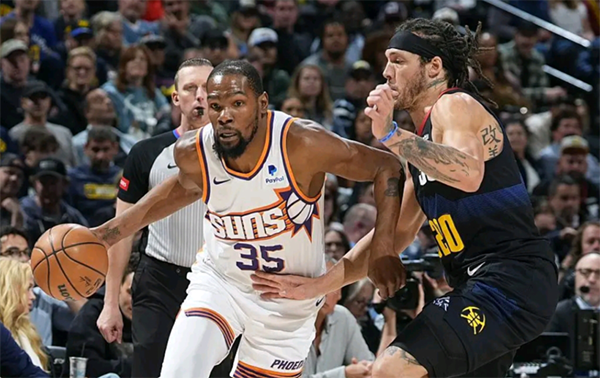 末节,太阳替补扩大领先,约基奇早早上场,8分16秒杜兰特和布克同时回来,面对掘金的反扑,杜兰特吸引火力,布克连续助攻队友命中三分,杜兰特外线三分一击即中,关键后仰中投也有;最后3分钟,杜兰特被戈登撞倒造进攻犯规,约基奇造犯规想要三罚,太阳挑战成功,裁判认定阿伦没有犯规,最终太阳拿下胜利。