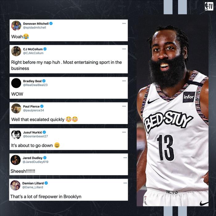 来源:JRS直播网01-14 09:03JRS直播网讯 北京时间1月14日,火箭、篮网、骑士和步行者正式达成四方涉及多名球员的超级大交易,篮网正式引援哈登,从而打造哈登、杜兰特和欧文组成的三巨头,哈登加盟篮网的同时创造一系列历史纪录,如此便能看出篮网三巨头的进攻火力有多猛?
