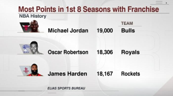 哈登效力火箭八个赛季,总共拿到18167分,仅次于大O罗伯特森(18306分)和乔丹(19000分)两大名宿,成为NBA史上效力一支球队八年总得分第三高的球员。