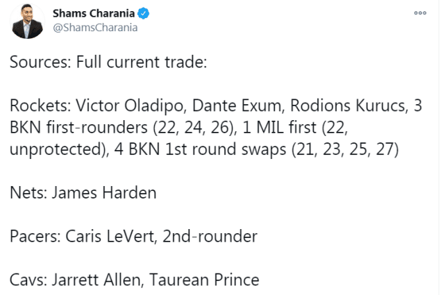 来源:JRS直播网01-14 08:52JRS直播网讯 北京时间1月14日,一笔关于哈登的四队大交易正式达成!篮网得到哈登,火箭得到奥拉迪波、埃克萨姆、库鲁茨、4个首轮和4次选秀互换权,步行者得到勒维尔和一个次轮签,骑士得到贾内特-阿伦和普林斯。
