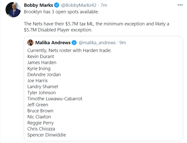 换来哈登后,篮网方面的新名单出炉:杜兰特、哈登、欧文、小乔丹、哈里斯、沙梅特、约翰逊、卡巴罗、格林、布朗、克拉克森、佩里、齐奥扎和丁威迪。马克斯表示,篮网还空出了3个名额,他们目前有570万的中产特例,底薪以及570万左右的伤病特例,可以用来引进新的球员。