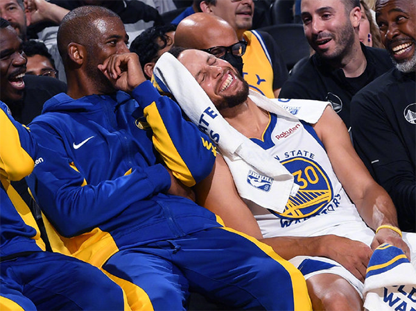 一场非正式的球员会议似乎正在举行,一群球员挤在球场上,身穿黄色连帽卫衣的库里站在中间,保罗也站在里面,库明加和小佩顿是为数不多的已经换好衣服的球员。