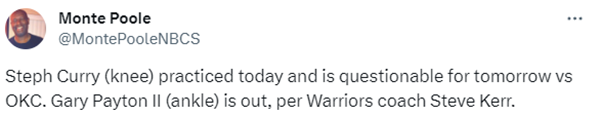 据勇士记者Monte Poole报道,勇士当家球星库里今日参加训练,出战状态升级为出战成疑,50%可能复出战雷霆,小佩顿因脚踝扭伤确认休战。