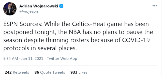 来源:JRS直播网01-11 16:26JRS直播网讯 北京时间1月11日,名记查拉尼亚报道称,多位消息人士确认,热火和凯尔特人的比赛将延期进行,这是本赛季第二场延期的比赛,此前,火箭和雷霆的比赛曾被延期。这场比赛延期的原因是热火凑不够比赛最低要求的8名球员。名记沃纳罗斯基报道称,联盟目前没有暂停赛季的打算,即便多支球队因疫情原因出现球员隔离的情况。