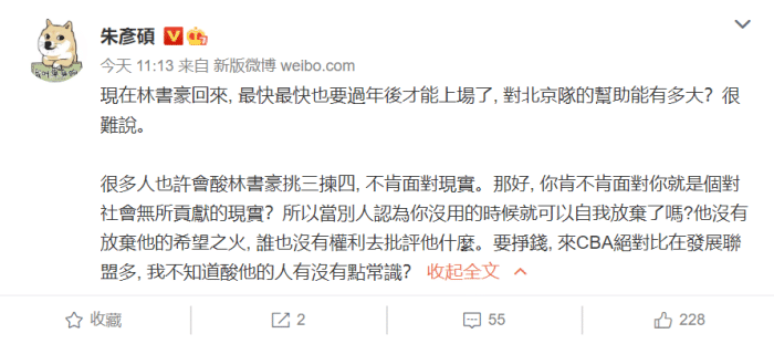 他签约发展联盟的消息引爆了网络,王猛等名嘴也是感慨万千发长文分析,宝岛名嘴朱彦硕则是直接力挺书豪怒喷那些嘲讽他的人“很多人也许会对林书豪挑三拣四, 不肯面对现实。那好, 你肯不肯面对你就是是个社会无所无所贡献的现实?所以当别人认为你没用的时候就可以自我放弃了吗?他没有放弃他的希望之火, 谁也没有全力去批评他什么。要挣钱, 来CBA绝对比在发展联盟多,我不知道酸他的人有没有点常识?”