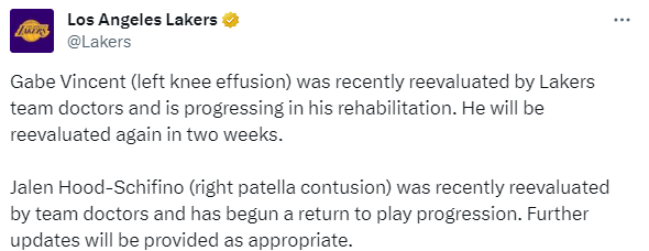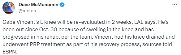 名记Dave Mcmenamin报道,文森特将在2周后接受复查,据球队介绍,自从10月31日以来,他一直因膝盖肿胀而缺席比赛,目前康复取得进展,据悉,文森特接受了抽取膝盖积液并接受了PRP治疗,这是他康复过程的一部分。
