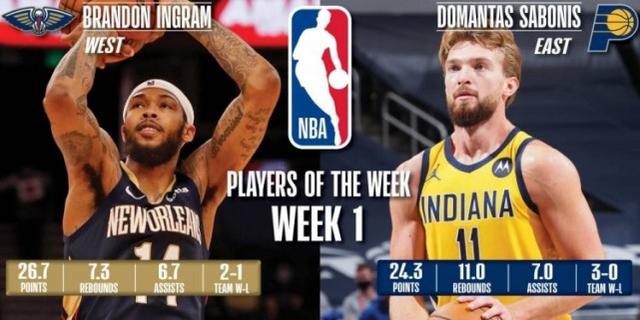 来源:JRS直播网12-30 20:01NBA新赛季战火重燃,经过一星期的角逐,各支球队的状态和近况大致能看出个七七八八。经过揭幕战、年终大战等重要战役的洗礼,首周的周最佳球员评选出炉,印第安纳步行者的多曼塔斯-萨博尼斯与新奥尔良鹈鹕的布兰登-英格拉姆分别当选。