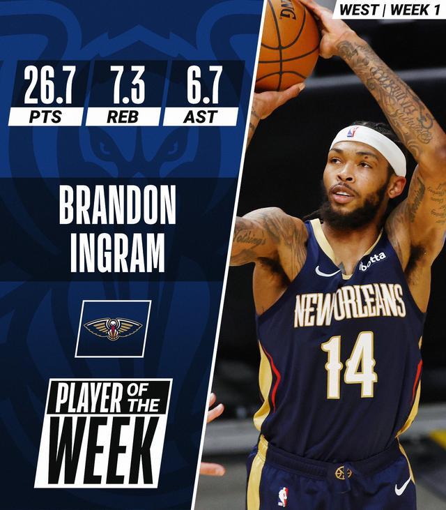 上周鹈鹕取得2胜1负的战绩,即使在万众瞩目的锡安-威廉姆斯身边打球,英格拉姆的光芒也不会被掩盖,他上周的成绩单为场均26.7分7.3篮板6.7助攻。即使是在鏖战不敌热火的比赛中,英格拉姆的表现也无可挑剔,他17中7砍下了28分2篮板3助攻,与锡安二人是唯二没有缴械投降的鹈鹕球员。如果不是他的拼死力战,恐怕那场比赛早早地会酿成大分差的惨案。