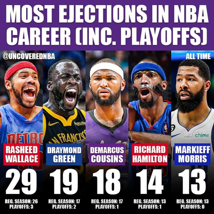 追梦本赛季第二次被驱逐,生涯19次驱逐次数排名历史第二多,美媒Uncoverednba统计了NBA历史被驱逐次数最多的球员排名——