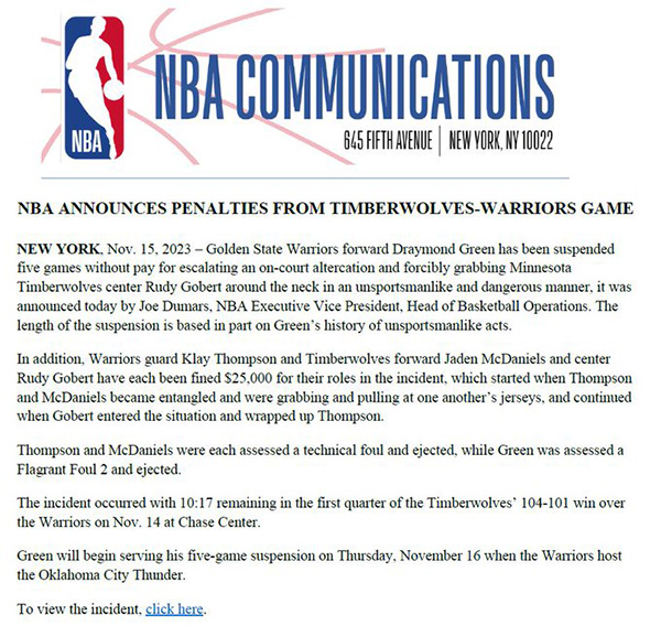 NBA官方声明,追梦升级了冲突,锁喉戈贝尔是非体育道德的危险行为,五场禁赛是基于追梦过去曾有过的非体育竞技动作的过往历史。
