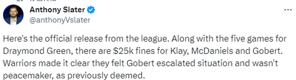 克莱和麦克丹尼尔斯相互拉拽球迷被罚款2.5万美元,戈贝尔因介入冲突并抱住克莱也被罚款2.5万美元。勇士记者Anthony Slater表示勇士队明确表示戈贝尔加剧了冲突,而不是像之前认为的是和平使者。