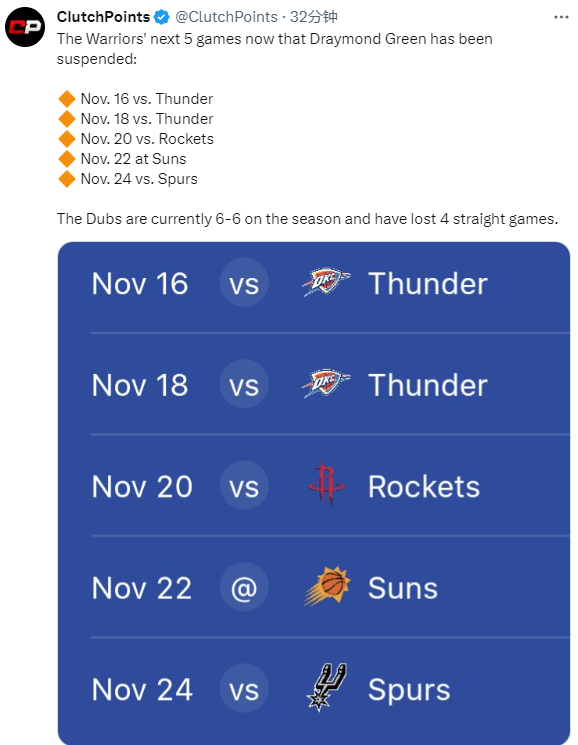 目前勇士遭遇4连败,6胜6负暂时排名西部第8位,库里因膝盖伤势继续休战,格林被禁赛,对于勇士来说,下一场对阵雷霆又是一场苦战,真到了维金斯、汤普森等人挺身而出的时候了。