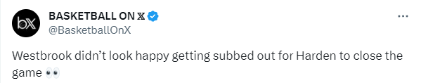 在快船输给联盟倒数的灰熊一战,比赛还剩1分55秒时,卢指导用哈登换下威少,美媒BASKETBALL ON