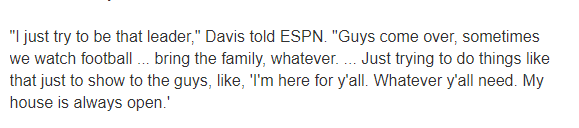 浓眉还表示:我只是想成为一个领袖,让他们可以来我家,有时我们一起看橄榄球,可以带上家人,我只是想做这样的事情,只是为了向他们表明,‘我会在这里支持你们,你们需要什么都可以,我的家永远为他们敞开。
