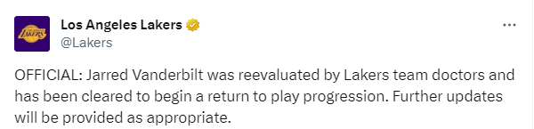 湖人官方更新范德比尔特的伤情,声明:湖人队医已经对范德比尔特的伤情进行了重新评估,他已经被允许重新参加比赛我们将酌情进行进一步的伤情更新。
