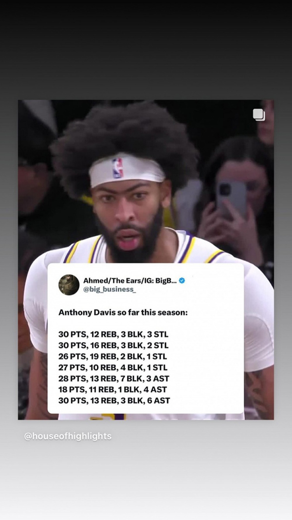 詹姆斯通过社媒晒出浓眉本赛季的多次单场拿到两双的全面数据,其中包括30分12篮板3抢断3盖帽,30分16篮板3盖帽2抢断,30分13篮板3盖帽以及28分13篮板7盖帽;赛季至今,浓眉共出战9场,场均得到23.9分12篮板3.7助攻3盖帽,场均盖帽联盟第一。