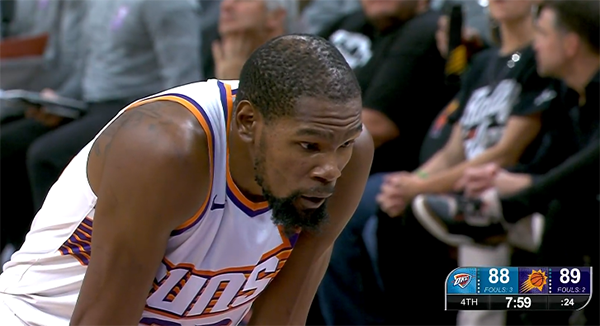 下半场,杜兰特摔倒没哨后他十分不满,之后杜兰特无解干拔得分,造犯规两罚全中,外线更是打成不讲理3+1,防守端,杜兰特顶板大帽多尔特以及大帽亚历山大;杜兰特下场后比尔带队,尤班克斯保护篮板并且造犯规,杜兰特为队友疯狂庆祝,KD激动不已。
