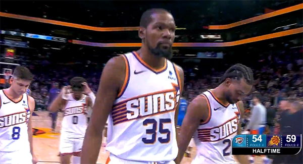第二节太阳和雷霆打得十分胶着,直到4分38秒,杜兰特才重新上场,命中一球以及两罚全中,带队反超比分,半场打完太阳59-54反超5分,杜兰特半场7中4拿到11分。