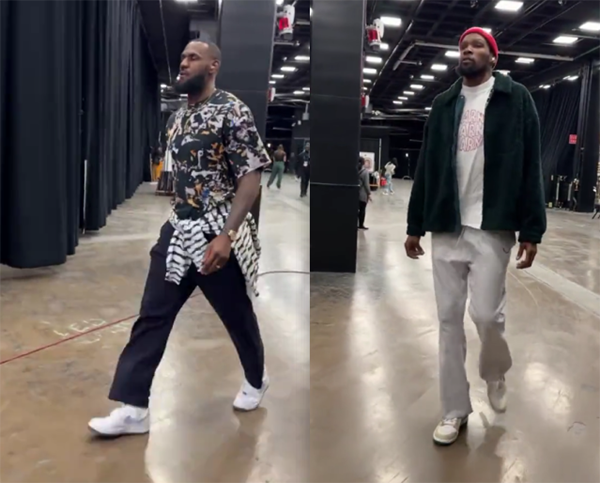 时隔15天再对决!詹姆斯帅气入场一脸严肃 杜兰特戴小红帽太抢镜