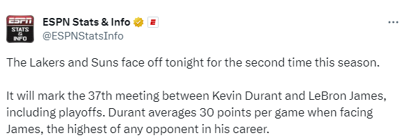 此前36次交手,杜兰特面对詹姆斯时,场均能够得到30分,成为詹姆斯生涯场均得分最高的对手;詹姆斯则是场均29.4分;在战绩方面,詹姆斯21胜15负略占优势。