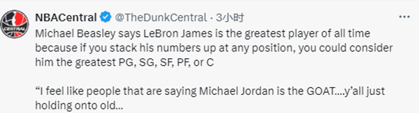 近日做客节目《The OGs》时,被问到“你心目中的GOAT是谁?”,比斯利表示:詹姆斯。而且我能给到你非常有力的论据。如果我们把历史上所有球员的数据放在一起比较,然后把名字都遮住,从中找到最强的控球后卫、得分后卫、小前锋之类的。你会把他的数据放在那儿,他会是最强的一、二、三、四甚至五号位;我觉得那些认为乔丹是GOAT的人,我不是不尊重你们哈,但你们就是太守旧了。