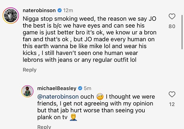 比斯利的言论引争议,前NBA球员内特-罗宾逊回应比斯利:别吸大麻了,我们之所以说乔丹是GOAT,是因为我们长眼了,我们能看到乔丹的场上表现就是更好。兄弟,没事儿,我知道你是詹密,没关系的。但是乔丹让地球上的每个人都想成为他,哈哈,而且还想穿他的鞋。我还从没见过有人穿詹姆斯的球鞋配牛仔裤或者正常的穿搭呢,笑死。”