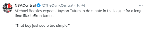 谈到凯尔特人球星塔图姆,比斯利表示:杰森-塔特姆,我的天。他有身高,有运动能力,而且很早就理解怎么打球。他会脚步动作,会拉杆,知道自己的肩有多宽。他会在联盟中打20年的,就像詹姆斯一样。我没有在这里说他会拿到四万分,但是他至少能拿三万多分。