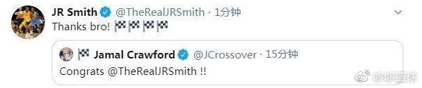 当JR签约湖人后,克劳福德第一时间在社交媒体上向JR送上祝贺,JR则回复:谢谢兄弟。帕金斯也在推特上表示“湖人现在就缺一个能够终结进攻的投手,现在他们得到了JR-史密斯!!!”可以说现在湖人阵容完整了,他们将用JR取代布拉德利去争夺总冠军,是个不坏的结果!