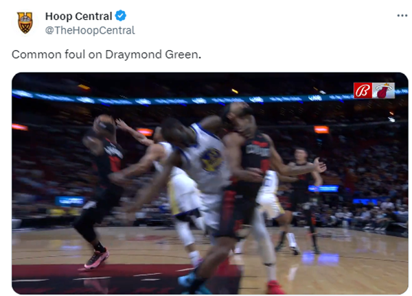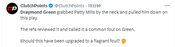 第一节9分44秒,追梦格林和米尔斯激烈卡位,阿德巴约抛投得分,裁判响哨,回放后裁判吹罚追梦格林卡位犯规在先,阿德巴约进球无效;从慢镜头可以看出,追梦有一个相当恶劣的脏动作,锁喉放倒了米尔斯,不过裁判并未升级为恶意犯规,仅仅吹罚普通犯规。