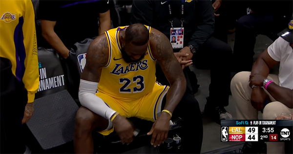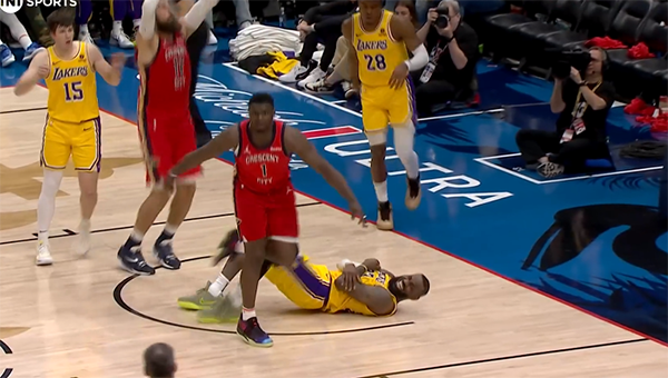 第三节10分37秒,锡安持球突破杀到禁区,詹姆斯站在合理冲撞区外面被锡安撞飞,39岁老詹重摔倒地,好像磕到手肘,龇牙咧嘴、面部表情十分痛苦,即使如此,詹姆斯仍没有下场休息,留在场上继续比赛,如此职业精神,不禁令人为他竖大拇指。