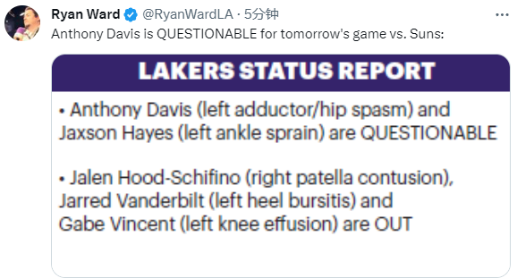 湖人官宣战太阳伤情:浓眉出战成疑3人缺战 太阳三巨头有望首次合体
