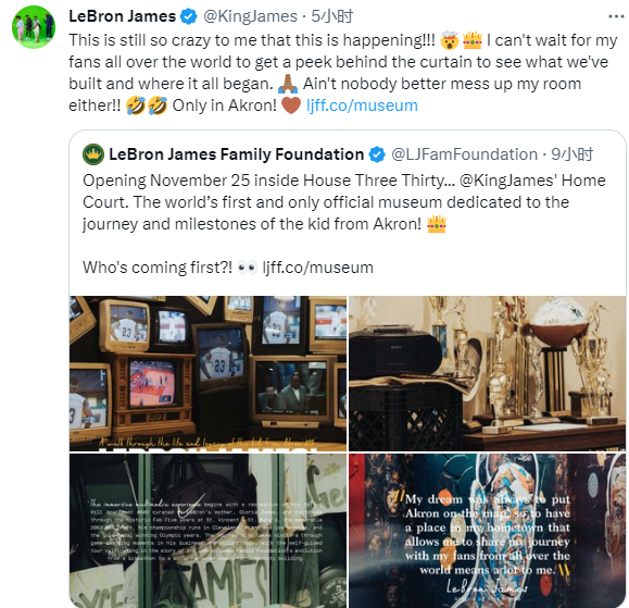 詹姆斯在声明中表示:我的梦想一直是让阿克伦成为一个为人所知的地方,因此能在我的家乡,创建一个与全世界球迷分享我个人历程的地方,这对我来说意义重大。
