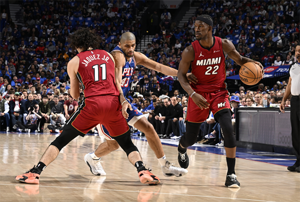 第二节,热火采用联防战术限制76人,巴特勒带队打出14-4攻击波,热火瞬间领先到11分;哈里斯和里德为76人打破僵局,可76人追到5分后又被热火扩大领先,赖特、希罗和马丁纷纷输送三分,半场打完热火领先12分。
