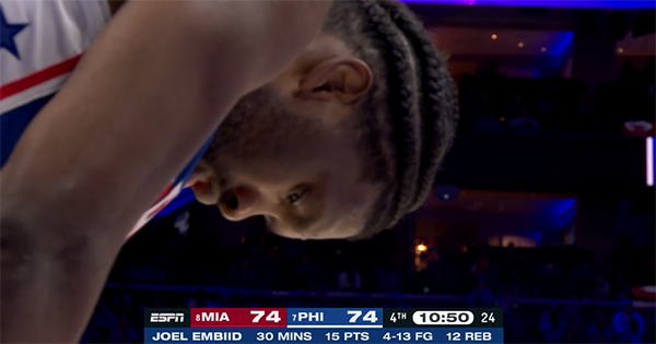 关键3分钟,希罗急停中投,恩比德大回环造犯规两罚全中以及外线命中三分,希罗再拿2分,恩比德关键2+1,海史密斯抛投2分,希罗致命失误,36秒恩比德助攻乌布雷打成制胜2+1,希罗三分被巴图姆大帽,乌布雷关键两罚全中,希罗续命三分太晚,最终76人主场拿下晋级之战,赛后恩比德和马克西大笑疯狂庆祝,巴特勒一瘸一拐离场。