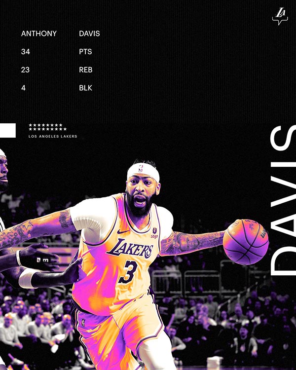湖人名宿魔术师发推写道:浓眉统治攻防,拿下34分23篮板,还有4次盖帽,两次拯救了比赛;里夫斯29分14篮板10助攻令人印象深刻,八村垒16分14篮板和拉塞尔29分12助攻,都贡献了两双。