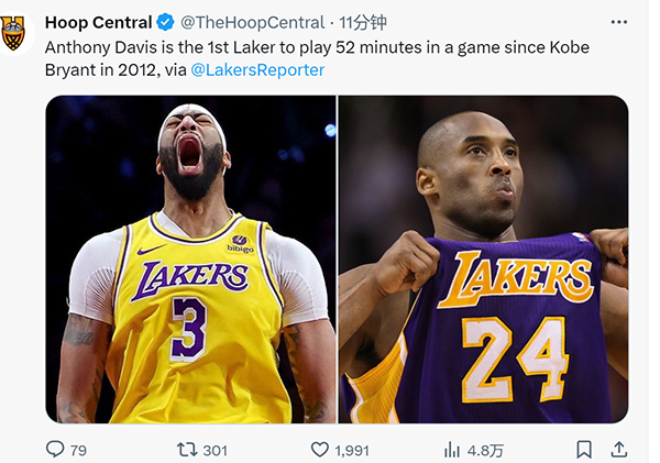 3、浓眉成为湖人队史继2012年3月13日(双加时)科比后出场时间最多的湖人球员,威少曾在21年11月26日对阵国王的比赛中出场51分10秒(3加时)