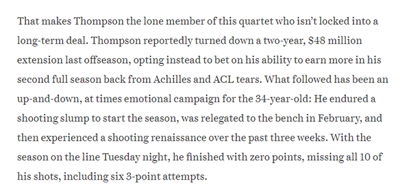 Logan Murdock报道,汤普森在去年休赛期拒绝了一份为期两年价值 4800 万美元的续约合同,而是选择押注自己在从跟腱和十字韧带撕裂中恢复的第二个完整赛季中能够赚取更多收入。但今年的表现让他很难匹配去年的这个报价。