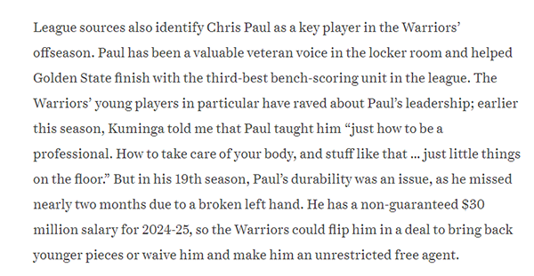 Logan Murdock报道,保罗是勇士在今年休赛期的关键球员。保罗在更衣室里是一位有价值的老将,并且在他的带领下,勇士取得了联盟第三高的板凳得分,勇士的年轻球员们对保罗的领导能力也是赞不绝口。保罗还有一年3000万的无保障合同,所以勇士在休赛期可以把保罗当作交易筹码,换回更年轻的球员,或者裁掉他,让保罗成为完全自由球员。