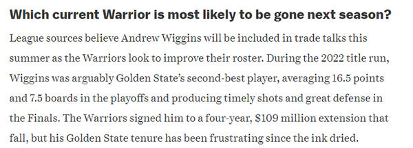 The Ringer记者Logan Murdock报道,联盟消息人士相信,维金斯将会在今年夏天被纳入交易谈判中,因为勇士希望改善球队的阵容。本赛季维金斯的表现令人感到沮丧,尽管在交易截止日后他的表现有所回暖,但库明加的出色发挥让维金斯显得有些多余。