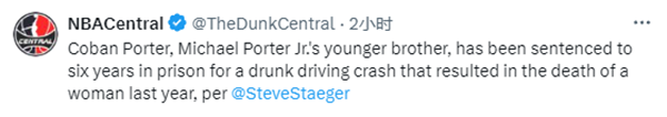 据丹佛当地媒体报道,掘金冠军成员小迈克尔-波特的弟弟科班-波特因醉酒驾驶致人死亡被判6年监禁。