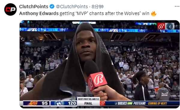 第三节期间,爱德华兹疯狂砍分后捶胸狂喷杜兰特,疯狂输出垃圾话,对此KD咧嘴大笑,如此一幕引热议,赛后爱德华兹接受采访时,现场球迷为他高呼MVP,华子静静聆听后表示:这场比赛很特别,但是这只是第一场,我们需要再拿下三场胜利,需要球迷们继续给我们打气。