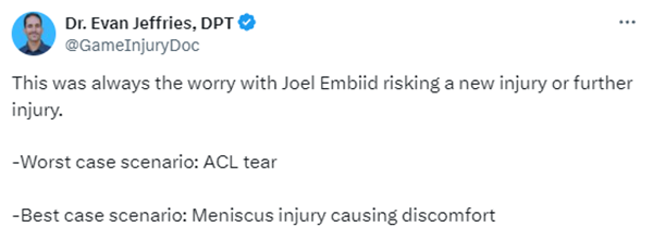 对于恩比德的伤势,医学专家Evan Jeffries表示人们都在担忧恩比德的伤病,最坏情况是十字韧带撕裂,最佳情况是半月板损伤导致不适。
