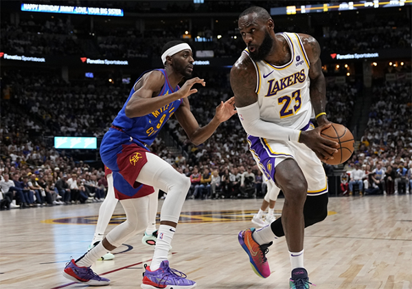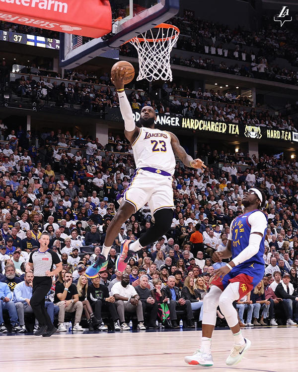 去年西决重演湖人大战卫冕冠军掘金,39岁的詹姆斯早早开启进攻模式,开场两次杀到禁区得分以及命中两记三分球,开场独砍10分后组织进攻,带领湖人压制掘金,第一节最后时刻,老詹反击上篮被雷吉凶狠犯规从而失衡倒地,首节打满12分钟,6投4中拿到12分5助攻3篮板1盖帽。