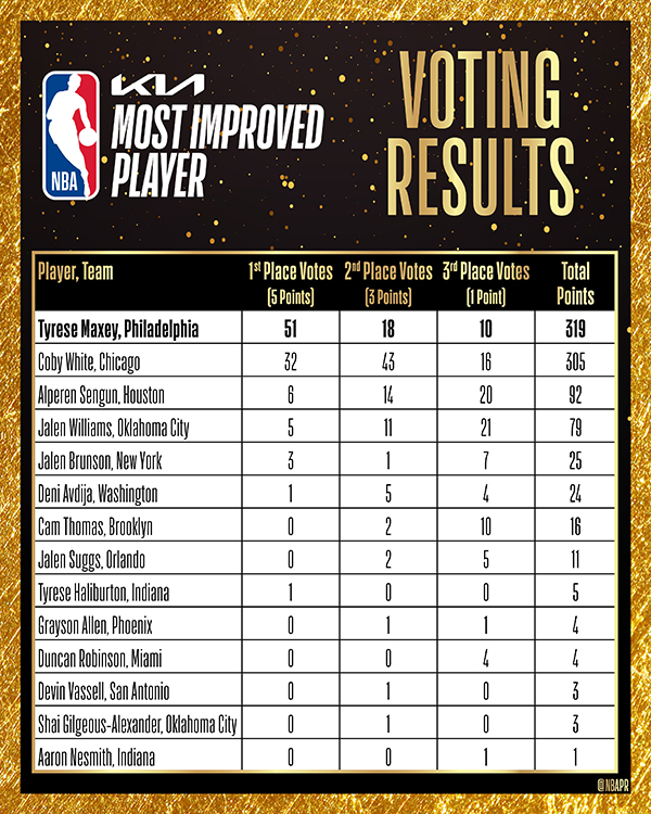 阿夫迪亚(24分)、卡梅隆-托马斯(16分)、萨格斯(11分)、哈利伯顿(5分)、格雷森-阿伦与邓肯-罗宾逊(4分)、瓦塞尔与亚历山大(3分)、内史密斯(1分)均获得选票。