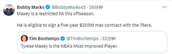 薪资专家Marks发推写道:马克西在休赛期将成为一名受限制自由球员。他有资格与76人队签订一份为期五年、最高价值2.05亿美元的合同。
