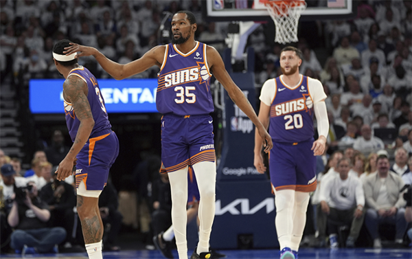 第二节,杜兰特和比尔带队21-10扭转局面,康利回应三分,杜兰特和布克得分回击,可上半场最后2分30秒太阳再次断电,被森林狼6-0反扑,半场打完太阳51-50反超1分;这一节杜兰特4中3拿到9分,比尔5中3拿到7分,值得一提的是,唐斯因首节3犯导致第二节一直坐在替补席。