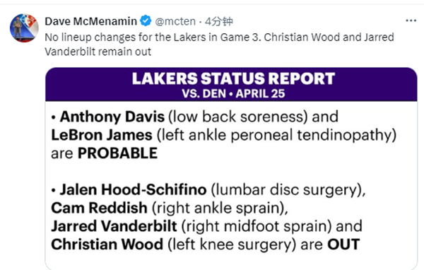 来源:JRS直播网04-25 14:31JRS直播网讯 北京时间4月25日,湖人官方正式公布与掘金系列赛G3的伤病报告,詹姆斯和浓眉大概率出战,伍德和范德比尔特等4人因伤继续缺席比赛;ESPN继续看衰湖人,看好掘金拿下G3从而3-0夺赛点。