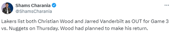 名记shams报道,原计划G3复出的伍德取消复出。目前湖人总比分0-2落后,根据赛程,湖人和掘金系列赛G3将在明天上午10点开打,双方转战洛杉矶。