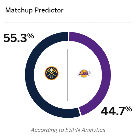 ESPN预测湖人和掘金G3胜率——湖人44.7%和掘金55.3%,美媒看好掘金客场取胜,换言之,ESPN看好掘金3-0夺赛点。
