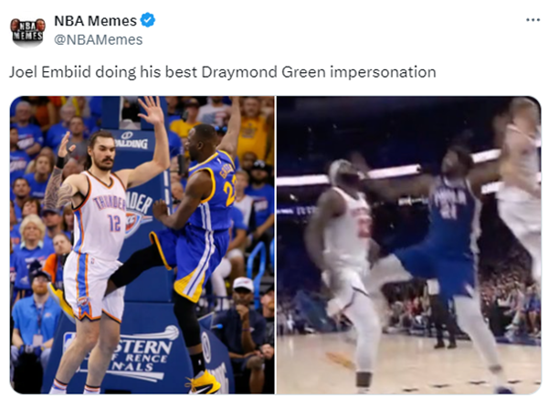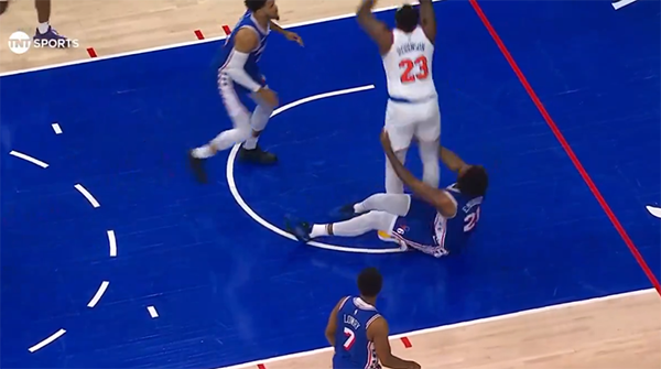 第二节,恩比德中投得分后踢到米罗的裆部,后者痛苦倒地,大帝如此动作也引争议。